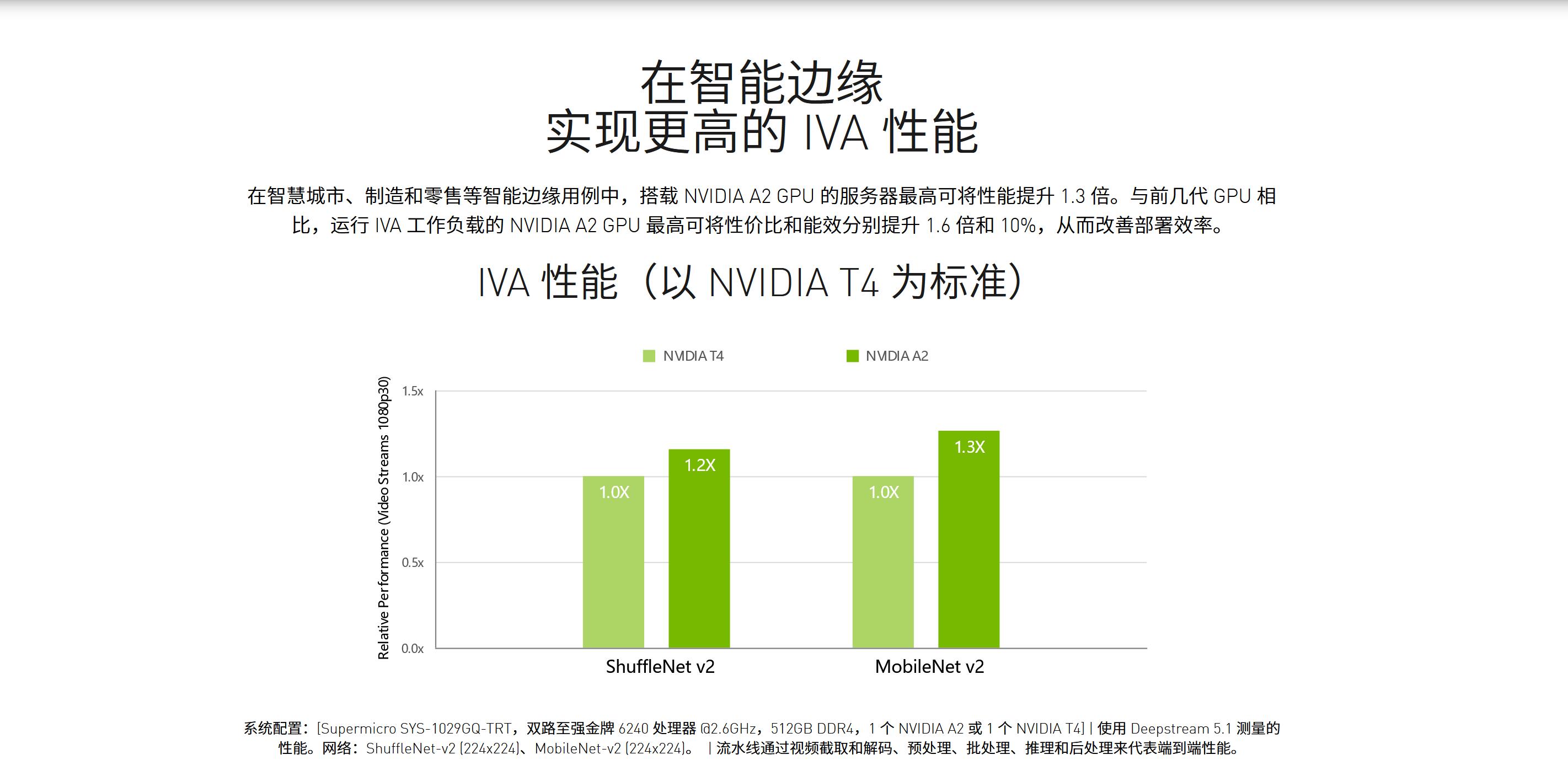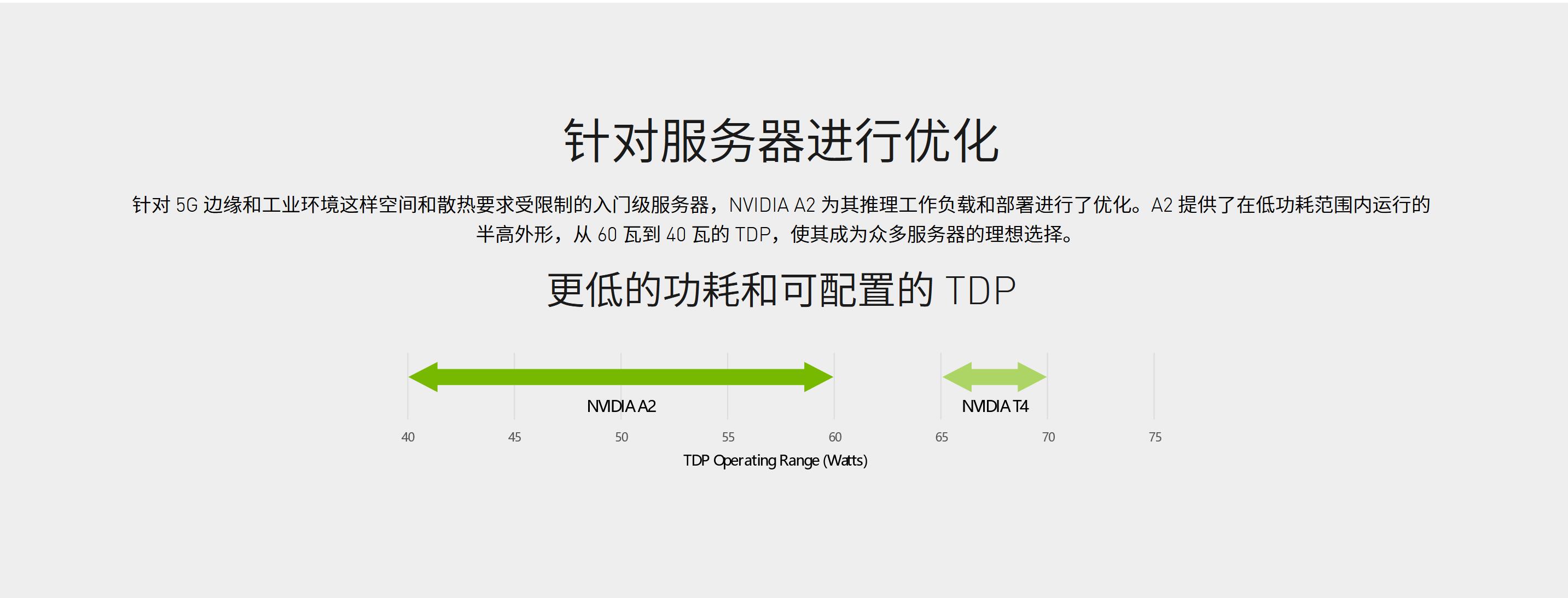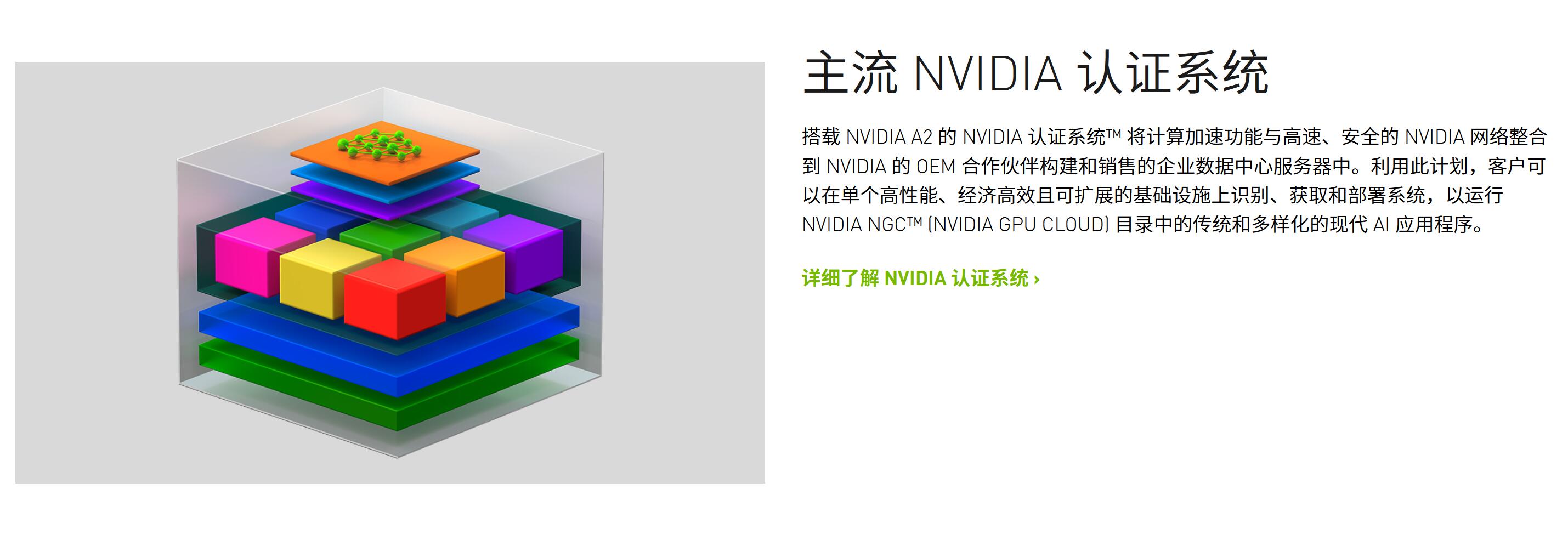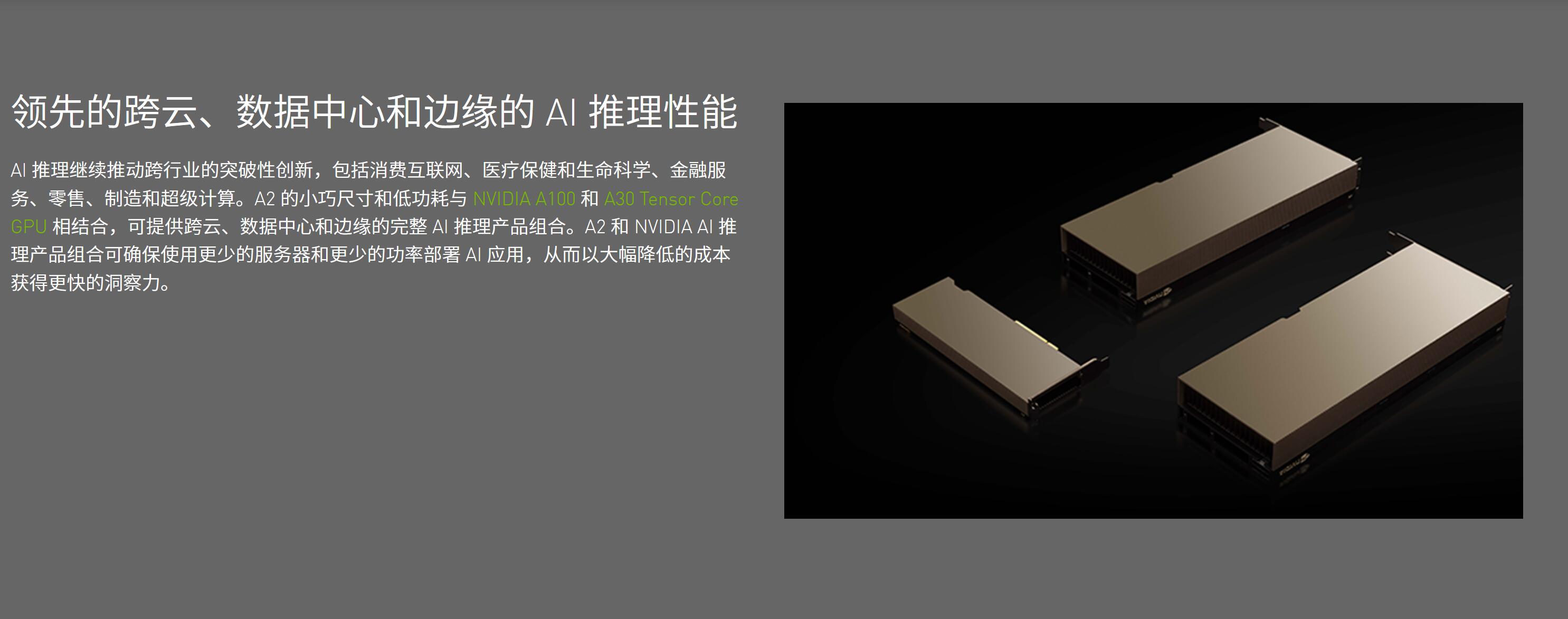 NVIDIA A2 Tensor Core GPU (英伟达显卡A2) 技术参数 NVIDIA A2 Tensor Core GPU 具有低功耗、小尺寸和高性能的特点,可为在边缘部署 NVIDIA AI 的智能视频分析 (IVA) 提供入门级推理功能。该 GPU 采用...
